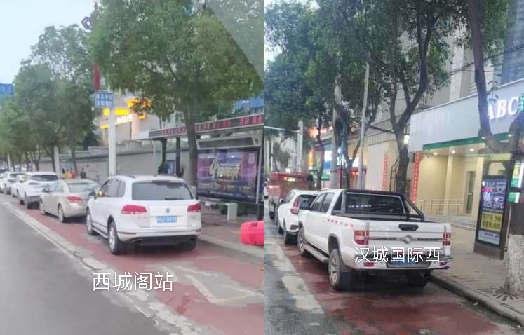在金州廣場南站,十幾輛私家車“整齊劃一”的停在公交車站位置,地面紅色區(qū)域上的公交兩字也被完全覆蓋,從遠處望去,站牌旁坐著幾個人正等待公交車的到來。在興華名城站,一輛私家車??吭诠卉囌厩埃倎淼墓卉嚐o法按其規(guī)定進站停車。在西城閣站和漢城國際西站,幾輛私家車甚是“任性”,儼然將公交車站當(dāng)成了“停車場”,筆者在此駐足十幾分鐘,它們依然“紋絲不動”,有的車上甚至沒有車主。